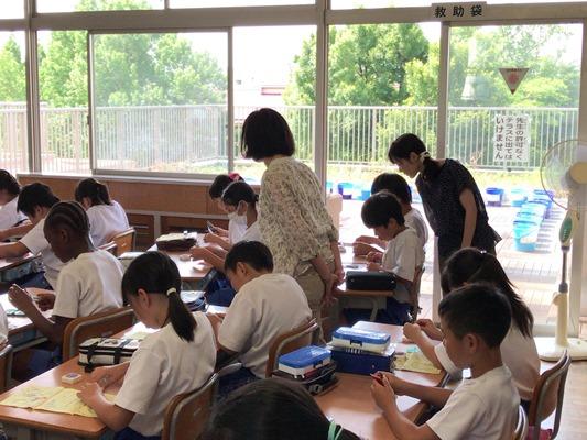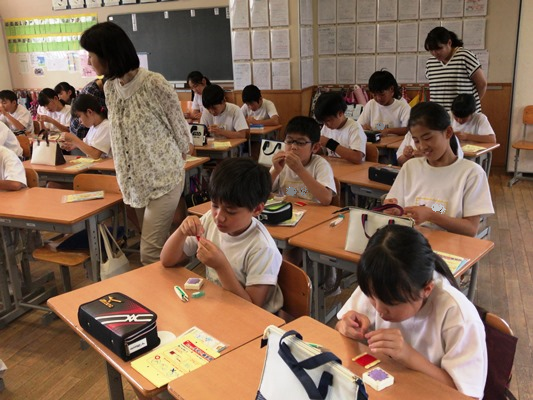 5年生の家庭科の時間に「初めて見よう!ソーイング」という授業で、初めて裁縫道具を触る授業です。家で裁縫をやっている児童もいて、手慣れている子もいました。今回は、クラスの学校応援団の保護者の方が3名、お手伝いに入っていただきました。お忙しいところ、ありがとうございます。