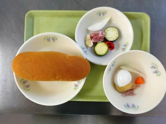 今日の献立は「きなこ揚げパン・ラタトゥイユ・洋風かき玉スープ・