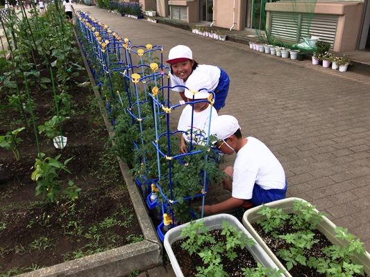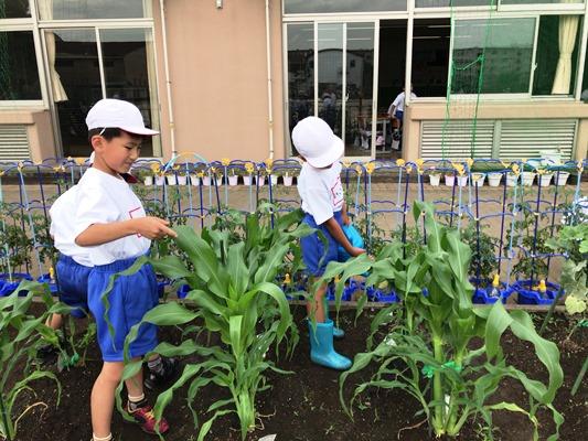 2年生の教室前では、夏野菜が収穫の時期になってきました。4月から育てているミニトマトの実は赤く色づいています。畑にいた男子が、「先生!トウモロコシの花が咲いているよ!」と、教えてくれました。トウモロコシの実が早く採れるといいですね。