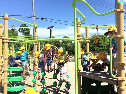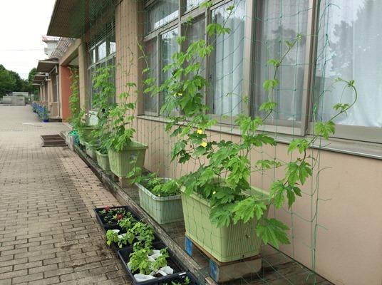 5月に栽培委員が植えたゴーヤの苗が大きくなりました。実も大きく育ち、もう少しで食べられそうです。もう少し大きくなると夏の日差しもさえぎってもらえそうです。イネの苗も、このところの暑さで大きくなりました。秋の実りが待ち遠しいです。
