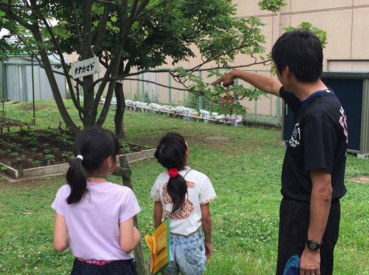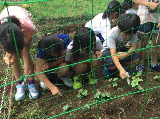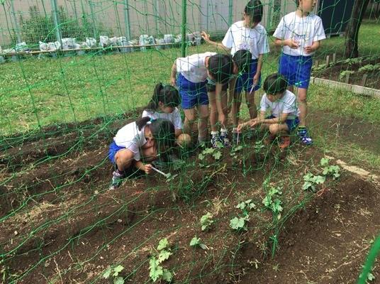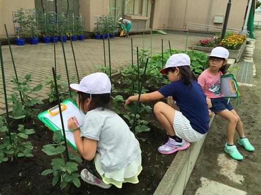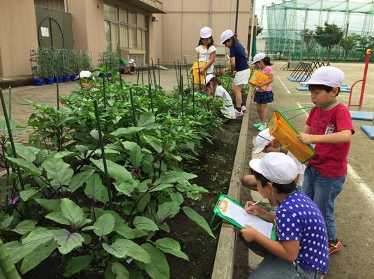 3時間目に2年生のあるクラスでは、生活科で自分たちが育てている野菜の観察をしました。先月、苗や種で植えた野菜たちが大きくなり、花が咲いて実をつけ始めました。植物の成長もずいぶん早いですね。