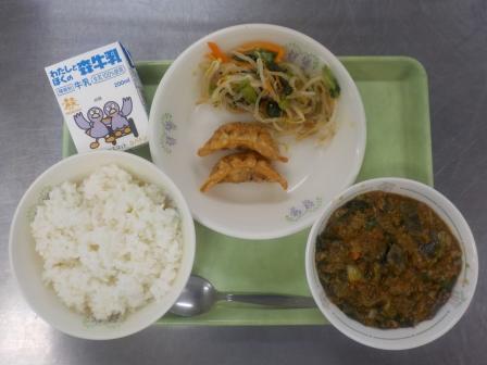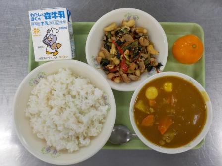 今日の給食は「麦ごはん・カレー・鶏肉と