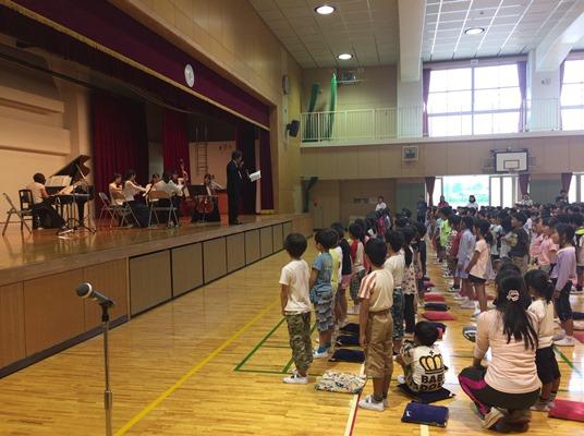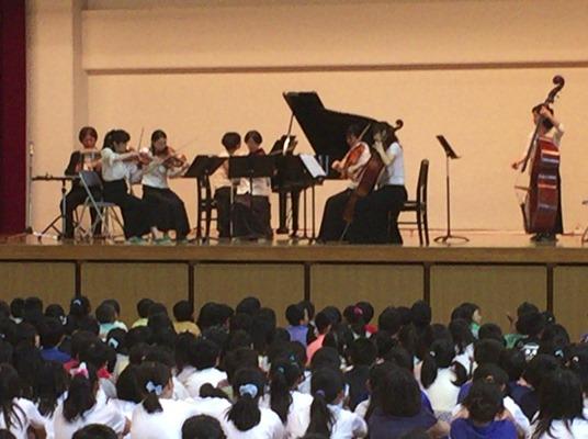 今日は、音楽鑑賞会が体育館でありました。演奏してくださったのは、東京芸術大学の卒業生を中心に結成された「アンサンブル・ディヴェルターズ」です。弦楽器を中心に結成された楽団で、心地よい生演奏を聴くことができました。また、生演奏に合わせて、今まで音楽の時間に練習してきた『この星に生まれて』を歌うこともできました。子どもたちは、とても明るくきれいな声で歌うことができました。
