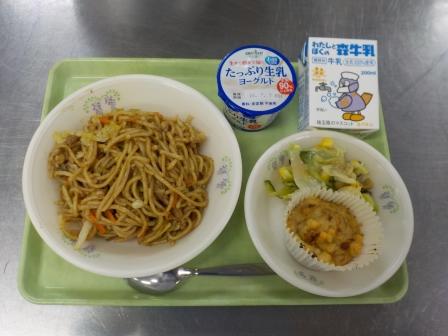 今日の給食は「焼きそば・牛乳・ツナとポテトの