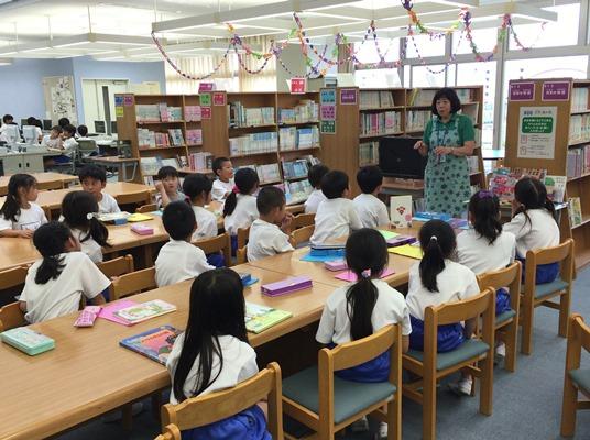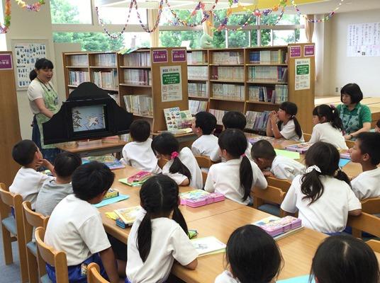 2年生の「図書室オリエンテーション」をやっていました。本の楽しみ方、借り方・返し方、もしも本が破れたら・・・などのお話を聞くことができました。また、紙芝居も見ることができ、うれしい時間になりました。