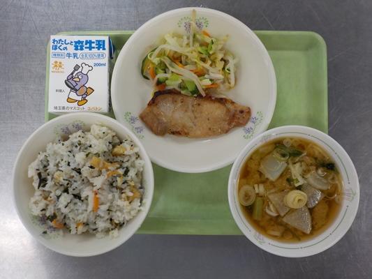 わかめごはん、豚肉のオイスターソース焼き、キャベツの辛し和え、こしね汁、牛乳