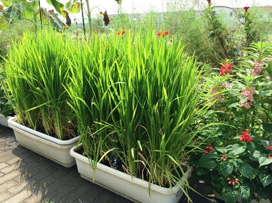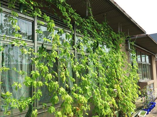 夏休みの子どもたちがいない間にゴーヤのカーテンが大きくなりました。夏の強い日差しを遮っています。校庭のあちらこちらにあるイネの苗も大きくなり、白く小さな花が咲いています。秋の収穫が楽しみですね。