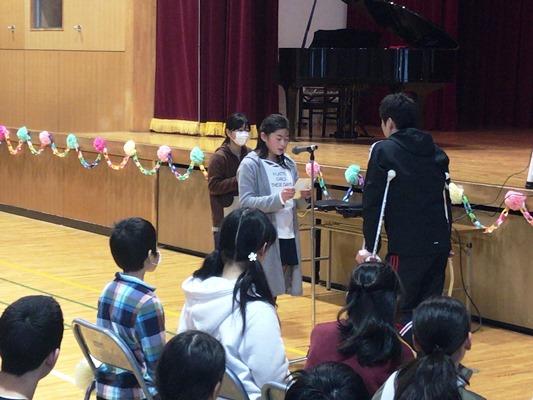 今日は、6年生を送る会が行われました。1年生から5年生は、学年ごとに工夫をこらしながら、6年生を送る言葉と出し物を披露しました。とても、気持ちのこもった素晴らしいプレゼントでした。お返しに、6年生からは、よびかけと歌のプレゼントをしました。感動と心温まる「6年生を送る会」になりました。