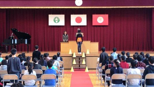 今日は、全校朝会でした。初めに、校長先生より、本校の6年生も参加した「認知症理解のDVD」を視聴しました。私たちの身近な問題として、考えて行動していきたいですね。次に、生徒指導担当から、今月の生活目標の発表がありました。1年生の有志も参加しての発表でした。3月の生活目標は、『1年をふりかえり感謝しよう!』です。これまでお世話になった人やものに感謝しましょう。
