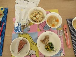 メニューは、豚肉ときのこのガーリックピラフ・牛乳・ハーブチキン・コーンサラダ・コンソメスープ・チョコレートケーキでした。