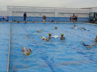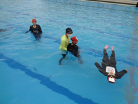 万が一の事故に備え、各学年で着衣水泳を行いました。(天候などの影響でできない学年もありました)水着で泳ぐのと服を着たまま泳ぐのでは体感する重さが違い、水泳が得意な子もなかなか自由に動き回れませんでした。高学年では、ペットボトルやビニール袋を使った浮かび方など、いざというときに命を守るための行動を学びました。