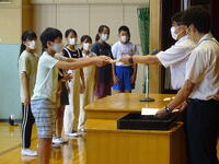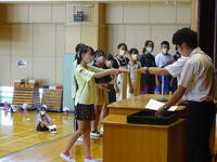 11日(月)に表彰朝会を行いました。今回は先日行われた硬筆と陸上競技大会の表彰です。硬筆では、市内硬筆展、県中央展覧会の表彰です。代表として2名の児童が登壇しました。市内陸上競技大会では、入賞した21名の表彰を行いました。硬筆展も陸上競技大会もどちらも大変立派な態度で臨むことができました。表彰されたみなさん、おめでとうございます。