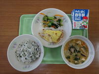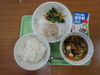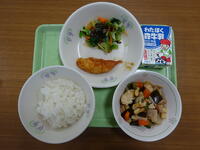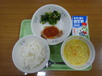「きなこ揚げパン、鶏肉のトマト煮、ワンタンスープ、」