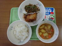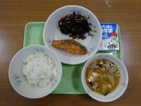「鮭の竜田揚げ、ひじきの煮つけ、豚汁」