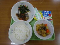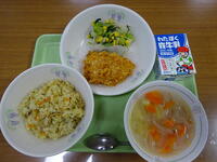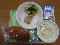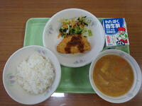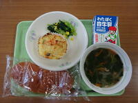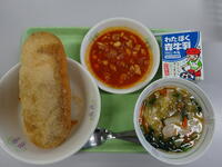 「きなこ揚げパン、鶏肉のトマト煮、ワンタンスープ、」