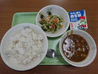 「麦ごはん、カレールウ、バンバンジーサラダ」
