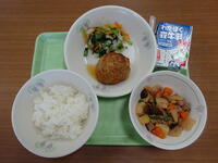 「大豆ハンバーグ、梅肉和え、たけのこの煮物」