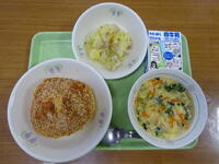 「焼きカレーパン、ジャーマンポテト、卵スープ」