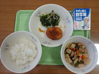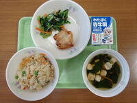 「こぎつねご飯、鶏肉の照り焼き、華風和え、お吸い物」