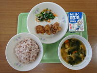 「赤米ごはん、鶏肉のから揚げ、えのきたけのお浸し、味噌汁」