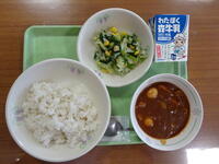 「麦ごはん、ハヤシルウ、コーンサラダ」