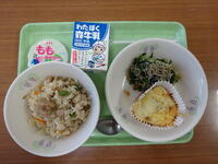 「鶏肉とごぼうのピラフ、かぼちゃのグラタン、パリパリサラダ、ももゼリー」