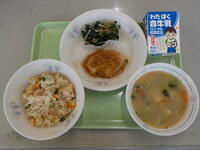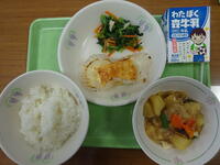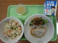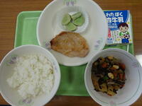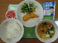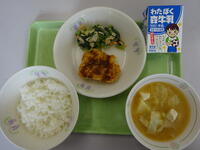 「ご飯、牛乳、チキンカツ、青菜とかんぴょうの和え物、みそ汁」