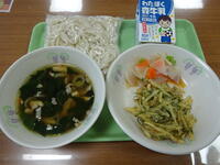 「地粉うどん、牛乳、肉うどん、おかひじきのかき揚げ、即席漬け」