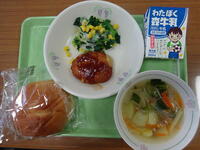 「子どもパン、牛乳、ハンバーグマリアナソース、コーンサラダ、マカロニスープ」