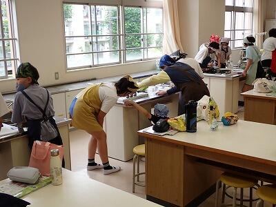 グループの役割分担に沿って調理開始。1組では、包丁を握るのは男子の方が多いようです。