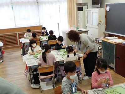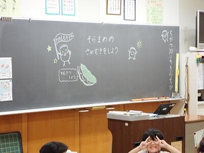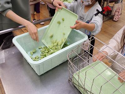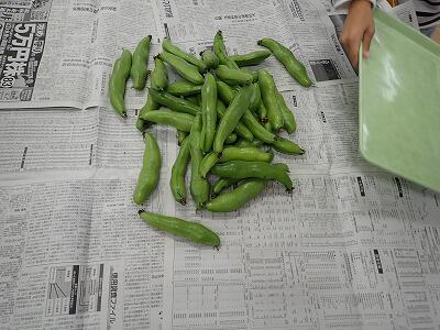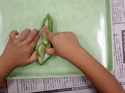 1校時1年生は、今日の給食に使うそらまめのさやむき体験。