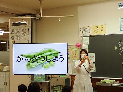 給食を担当する栄養士の先生のお話を聞き、さやむき体験スタート。