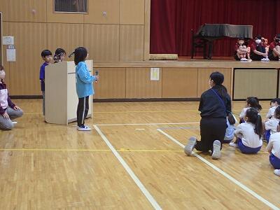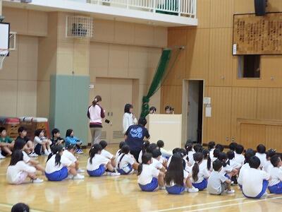 計画では、校庭でリレーの実演とともに行う予定でしたが、残念ながら雨のため体育館で行いました。