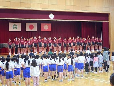 真新しいユニフォームを身を包んだ檀上こども達。程よい緊張感が感じられます。