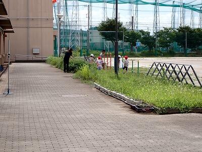 校庭の学年学級園では、南学級のこども達が先生と一緒に草取りを頑張ります。