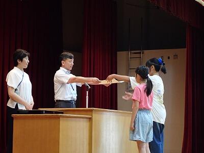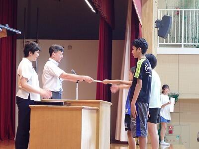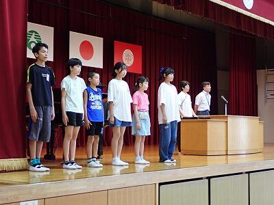 最後に、一学期活躍したこども達の表彰を行いました。表彰内容は、硬筆展、市内陸上大会でした。