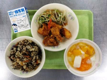 今日の献立は「ひじきごはん・牛乳・鶏肉のからあげ