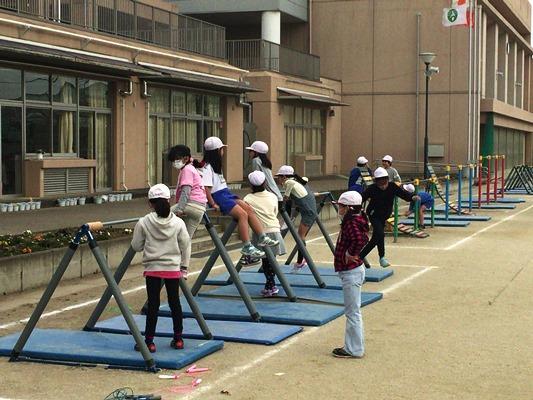 正門前では、縄跳びで競争です