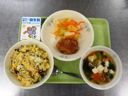 献立は「野沢菜とわかめのチャーハン・牛乳・