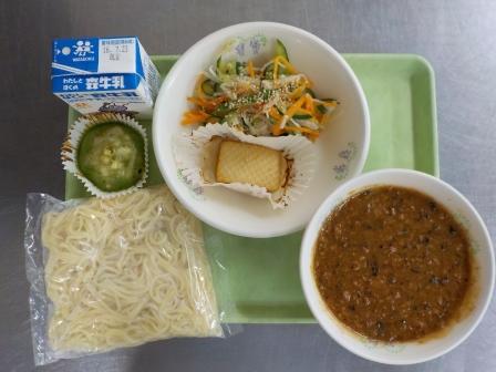今日の給食は「ジャージャー麺(肉・野菜)・牛乳