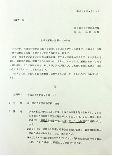 運動会は、25日(日)に延期になります。なお、明日(24日・土)は、休日になります。
