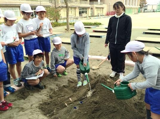 砂場で理科の実験をしていました。みんなで砂山を作り、頂上から水を流します。水の流れによって川ができ、がけが削られたり、砂が水で運ばれます。曲がった川の外側と内側では流水の違いはあるのか、斜面の傾きの違いと水の流れの関係などを観察しながら考えていました。