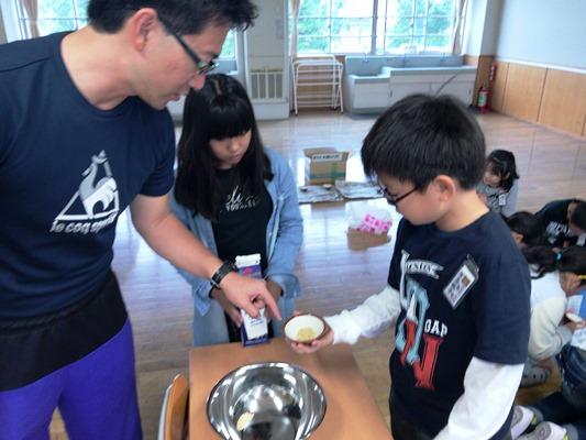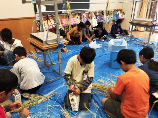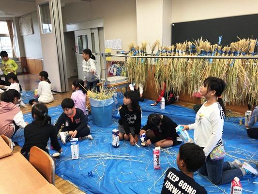 5年生が育てたイネをオープンスペースで乾かし、脱穀をしました。それをすりこ木でていねいにこすり、玄米にしました。あとは、試食が楽しみですね。