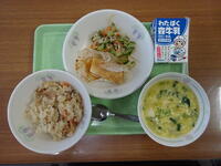 「中華風炊き込みごはん、いかのバター醤油焼き、ごま酢和え、華風コーンスープ」