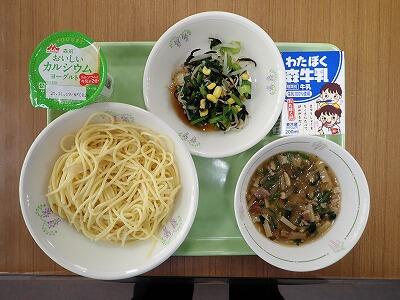 今日の献立は、きのこスパゲッティ、鉄骨サラダ、ヨーグルト、牛乳です。