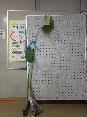 食材の納品の際に、実際に大きな葉っぱがついた太い親芋の茎をいただきました。
