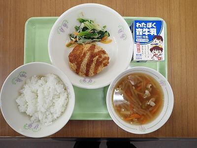 今日の献立は、親芋コロッケ、みそ和え、沢煮碗、ごはん、牛乳です。