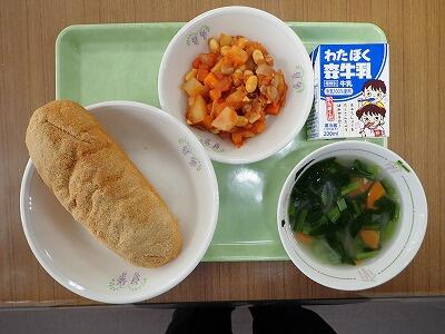 今日の献立は、ポークビーンズ、押麦のスープ、きなこ揚げパン、牛乳です。
