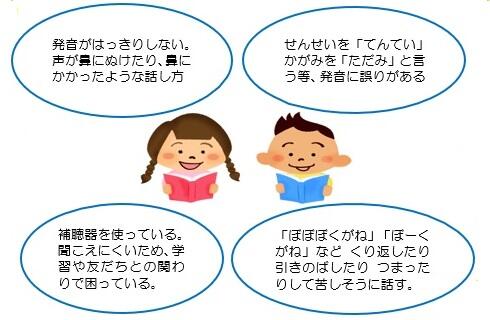 春日部市難聴・言語通級指導教室 ことばの教室 ことばの教室とは? お子さんのことばや聞こえについて心配がある方の相談を受け、ことばの改善を図り、お子さんがしっかりと学校生活に適応していくための支援を行っています。 このような心配があればご相談を このような指導をしています ○発語器官(くちびる、舌、下あごなど)の運動機能を高めたり、正しい音と誤った音を聞き分ける力を付けたりして、正しい発音ができるように導きます。 ○ことばの数を増やし、正しく組み立てられるようにしたり、場に合ったことばが使えるようにしたりするなど、ことばの力を伸ばします。 ○不安を取り除き、自分の気持ちを表現したり、楽な話し方を身につけたりできるようにします。 ○在籍学級の先生に、ことばの教室での様子を伝えたり、学級での様子をうかがったりして、ことばの改善に役立てます。 ○保護者の方とことばの改善のために必要なことを話し合ったり、家庭での練習の仕方を説明したりします。 詳しくはこちらから。 |