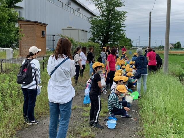 生活科の学習の一環として、2年生が近隣にある用水にザリガニ釣りに行きました。多くの保護者の方々に